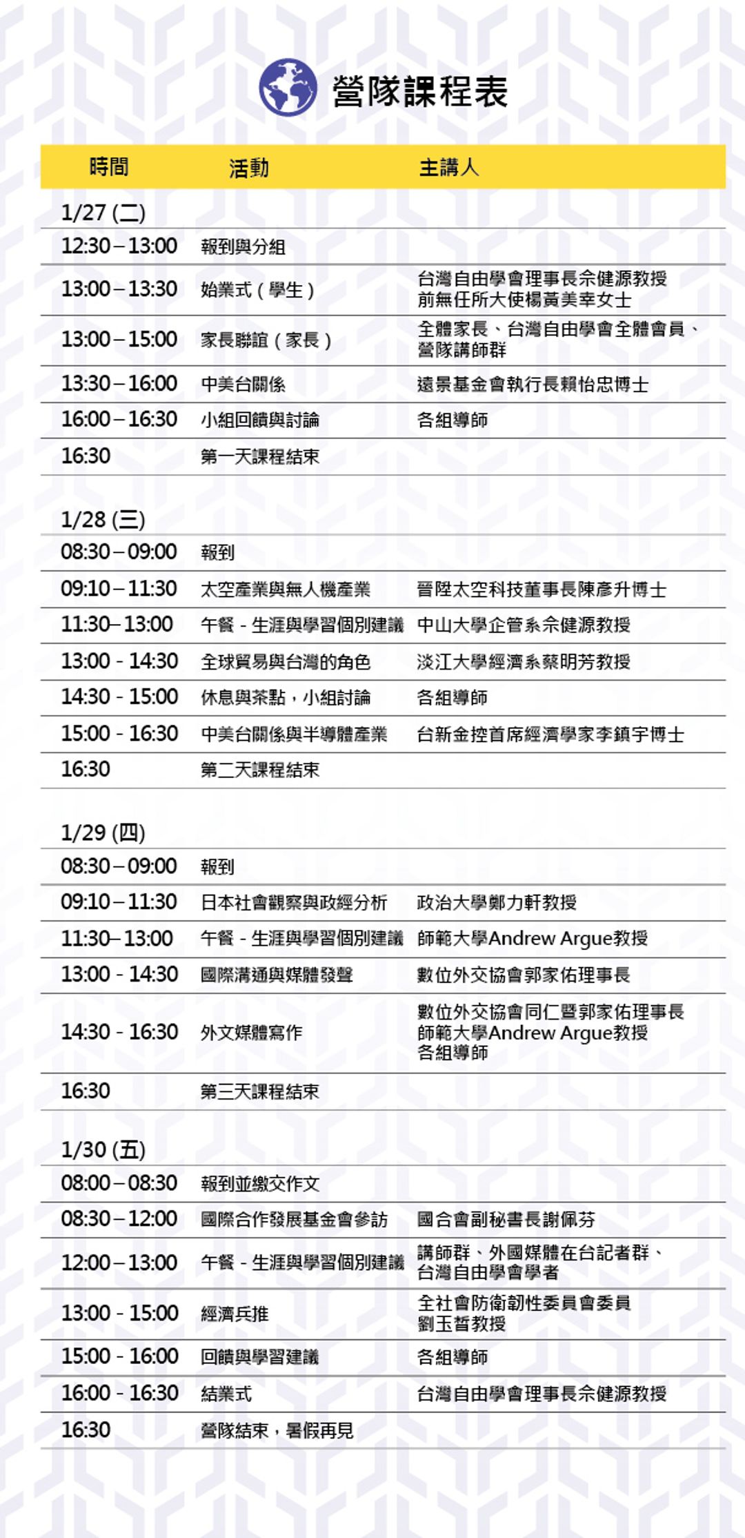 本營隊採用英國牛津大學(University of Oxford)的PPE(Philosophy, Politics and Economics)課程架構,從地緣政治出發,分析台灣的科技產業和金融市場,並結合媒體寫作與實作訓練,培養高中生分析國際情勢的能力,並累積英文發表。